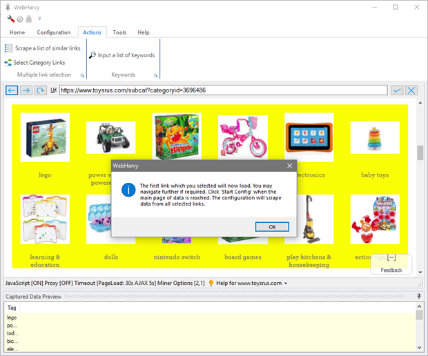 Following this the browser will load the first link which you clicked. From here you may navigate further, if required, using direct mouse clicks, to the final page which displays the data to be scraped. Once the page which displays the data to be extracted is loaded, click 'Start Config' to start configuration and select data. Your configuration will be automatically repeated for all selected links.