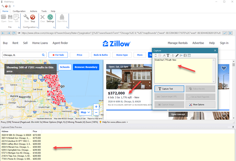 WebHarvy contains a built-in browser using which you can load and navigate web pages. To scrape data from Zillow, load within WebHarvy the property listings page at Zillow from which you need to scrape data and click on the start configuration button. (Know More)