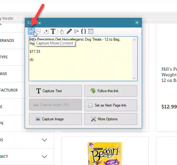 Click on the Capture More Content capture window toolbar option once or twice till the entire product tile text (including price) is displayed in the preview area.