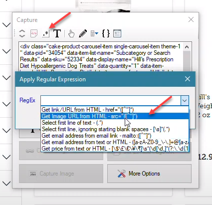 Click on the Apply RegEx capture window toolbar option and in the resulting window select the regex string for getting image URL from HTML.