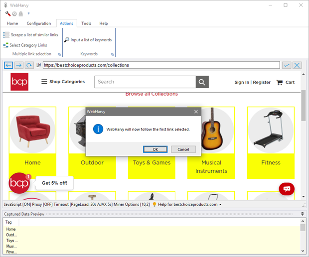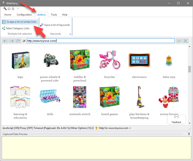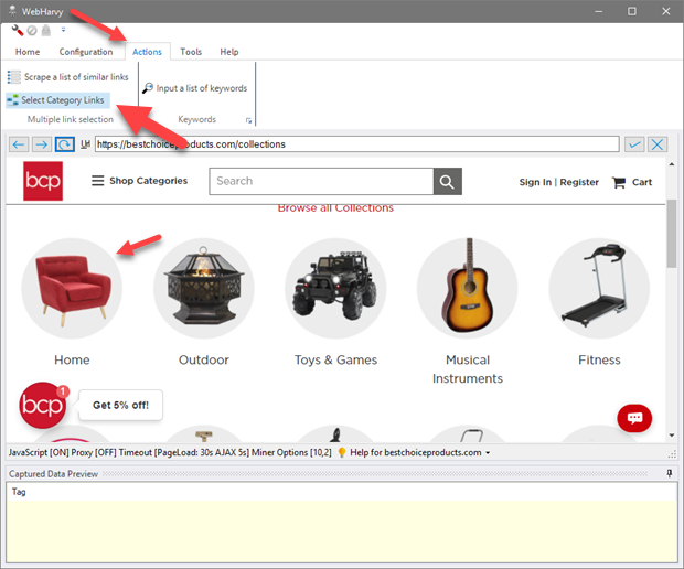 Suppose you need to extract product details listed under various categories of a website. After loading the page which displays links to various categories, click the Scrape a list of similar links button from Actions menu.