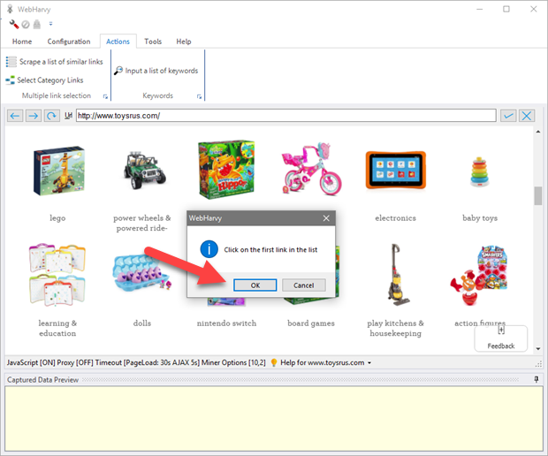 WebHarvy will ask you to click the first link in the list. Click OK and then click on the first link.