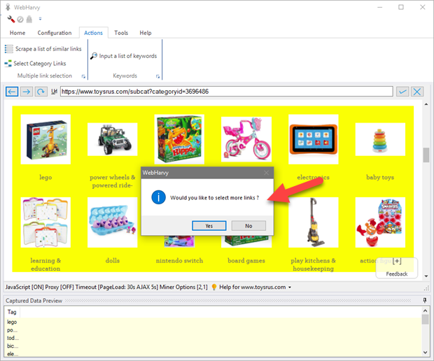 In case WebHarvy missed selecting any link, you may click 'Yes' and manually select more links one by one. Just click on a link to add it. When you are done selecting links, click any blank (white) space in the page and the following window will be displayed. Click OK.