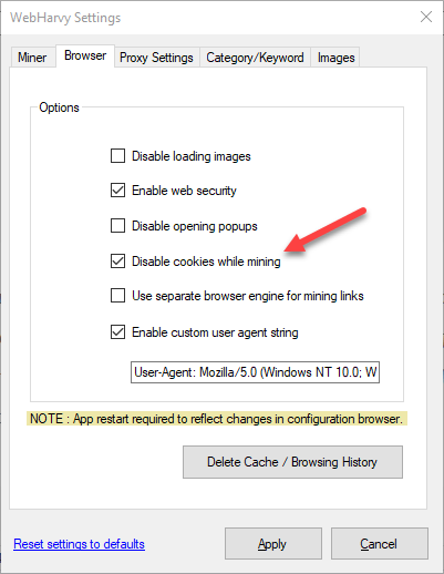 While using proxy servers for mining, it is recommended that you also enable the 'Disable cookies while mining' option in Browser settings. Websites can get details regarding your previous visits using cookies stored locally by the browser. WebHarvy will periodically delete browser cookies during mining when this option is enabled.